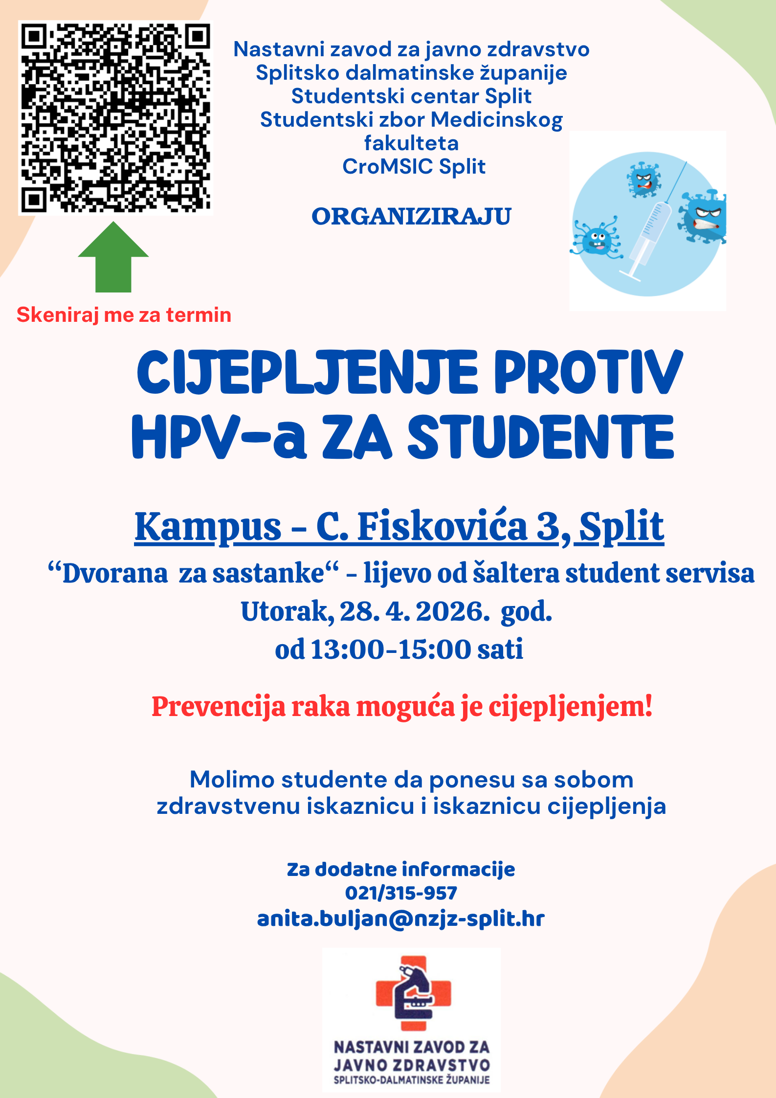 Pozivamo Vas na organizirano besplatno cijepljenje protiv HPV -a u organizaciji Nastavnog zavoda za javno zdravstvo SDŽ, Sveučilišta u Splitu, Studentskog centra Split i Studentskog zbora Sveučilišta u Splitu. Cijepljenje će se provoditi na punktu DVORANA ZA SASTANKE bez prethodne narudžbe. Cijepljenje će provoditi Služba za školsku i adolescentnu medicinu Nastavnog zavoda za javno zdravstvo SDŽ u: